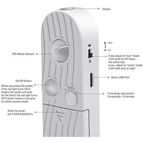 - 【Quatre Modes en Option】Capteur de mouvement et modes manuels: le bouton « ON/OFF » sur le dessus et les modes 24 heures et nuit: l’interrupteur « Soleil/Lune » sur le côté. Lorsque vous appuyez sur le bouton sur le dessus, si le voyant rouge s’allume, l’interrupteur fonctionnera tout le temps; si le voyant rouge s’éteint, il passe en mode détecteur de mouvement. Pour le mode « Soleil », il fonctionnera pendant 24 heures; Pour le mode « Lune », cela ne fonctionnera que la nuit.