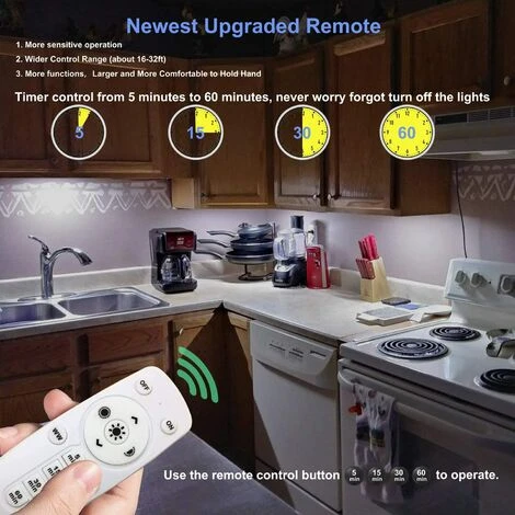 Nos avantages: Par rapport à la plupart des éclairages sous armoire à télécommande du marché, nos lampes peuvent également régler la couleur des lumières à l’aide de la télécommande. En outre,Nous avons ajouté une lumière pendant 120 minutes sans opération pour éteindre automatiquement les lumières. rendant le produit véritablement intelligent et économe en énergie.