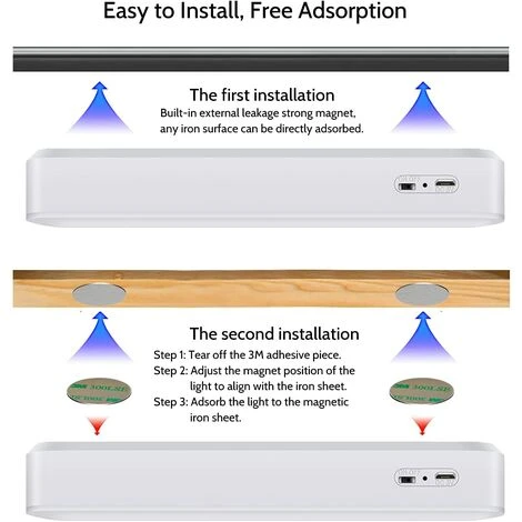 【Facile à installer et ne tombe jamais】Ces lumières LED Stick sont livrées avec deux bases adhésives et magnétiques, vous pouvez insérer la base adhésive 3M partout. Facile à installer et à enlever, sans aucun autre outil. La colle et l’aimant sont si puissants que les lumières restent en place tout le temps. Vous n’avez plus besoin de prendre le risque de choisir des lumières d’armoire qui tomberont !