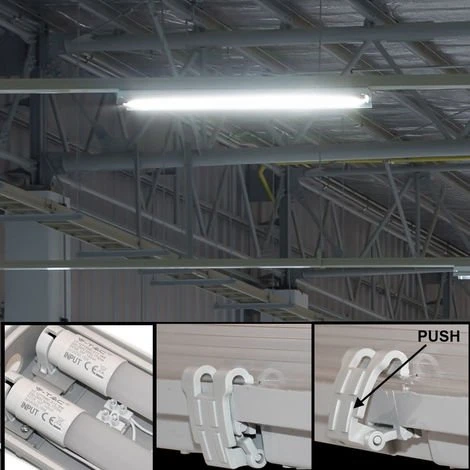 Description Plafonnier LED pour une utilisation dans les halls industriels, les ateliers et les entrepôts. luminaires pour pièces humides. Chaque zone est éclairée de manière optimale avec 3 400 lumens, qu’il s’agisse d’un lieu de travail, d’un sous-sol ou d’un garage !